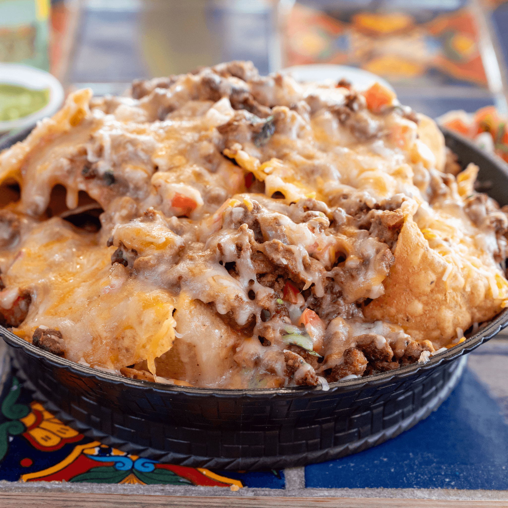 Our Super Nachos are the ultimate snack: crispy tortilla chips topped with beans, your choice of meat, and fresh pico de gallo, served with creamy guacamole, sour cream, and jalapeños on the side so you can build every bite your way.