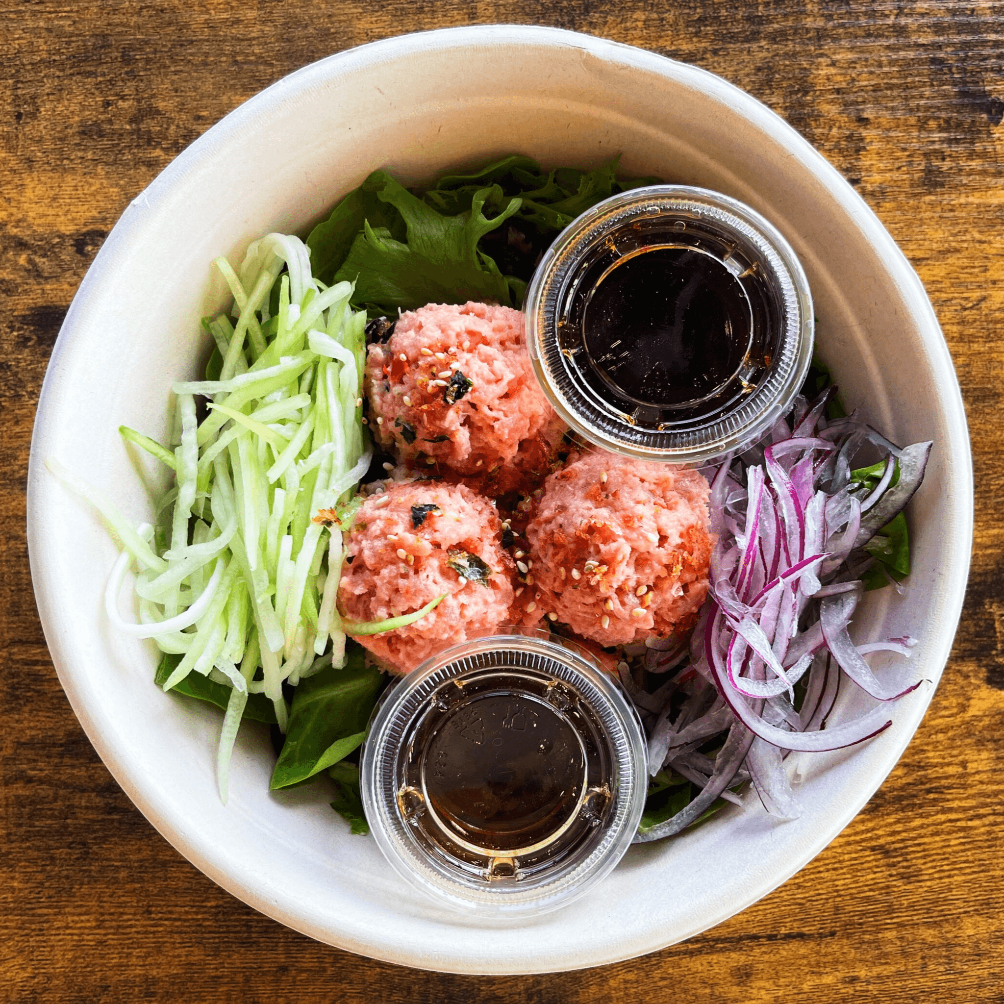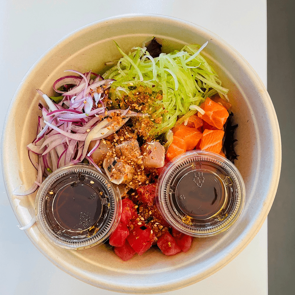 Tuna, salmon, albacore, cucumber, furikake, ponzu, sesame oil, red onion