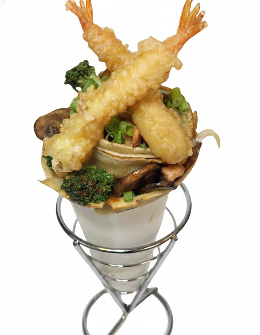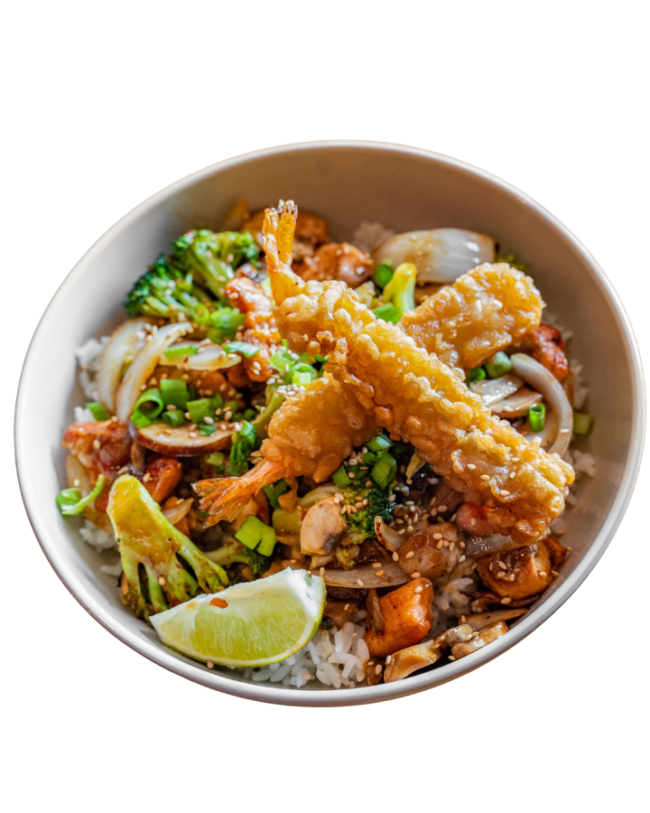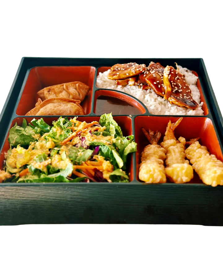 Grilled chicken or tofu teriyaki over rice, tempura shrimp with our house made ponzu, side salad with ginger-carrot dressing and 2 pork potstickers.
