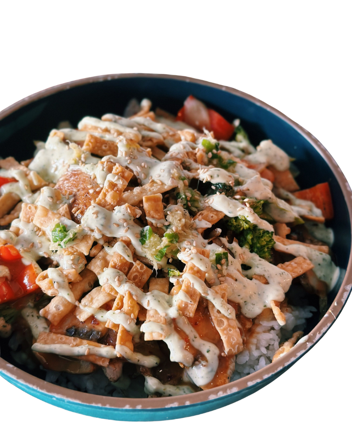 Marinated natural chicken breast, sautéed with crimini mushrooms, broccoli, red bell pepper, yellow onions, with chili garlic sauce, serrano aioli, topped with crispy wontons, sesame seeds, served over rice