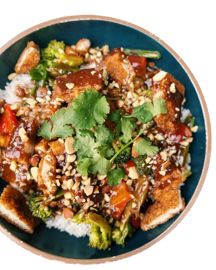 Katsu chicken breast, broccoli, red bell pepper, green onion, tamari almonds, cilantro with spicy almond soy served over rice *Contains Nuts*