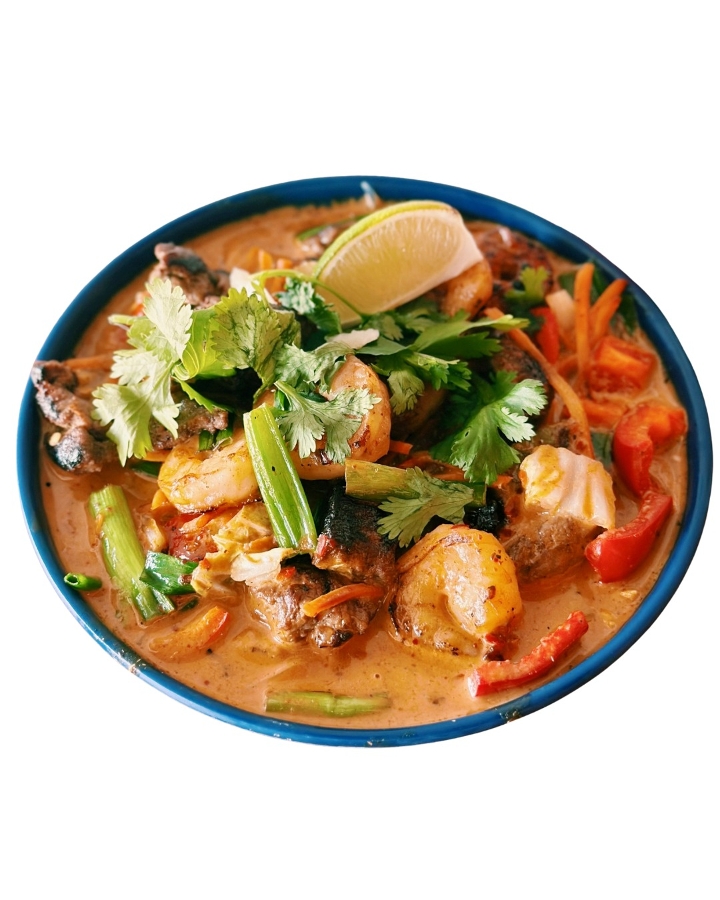 Organic steak and natural shrimp tossed with Napa cabbage, carrots, scallions, red bell peppers, tossed with Yellow Dragon sauce,finished with cilantro & lime with bean thread *Gluten-Free*