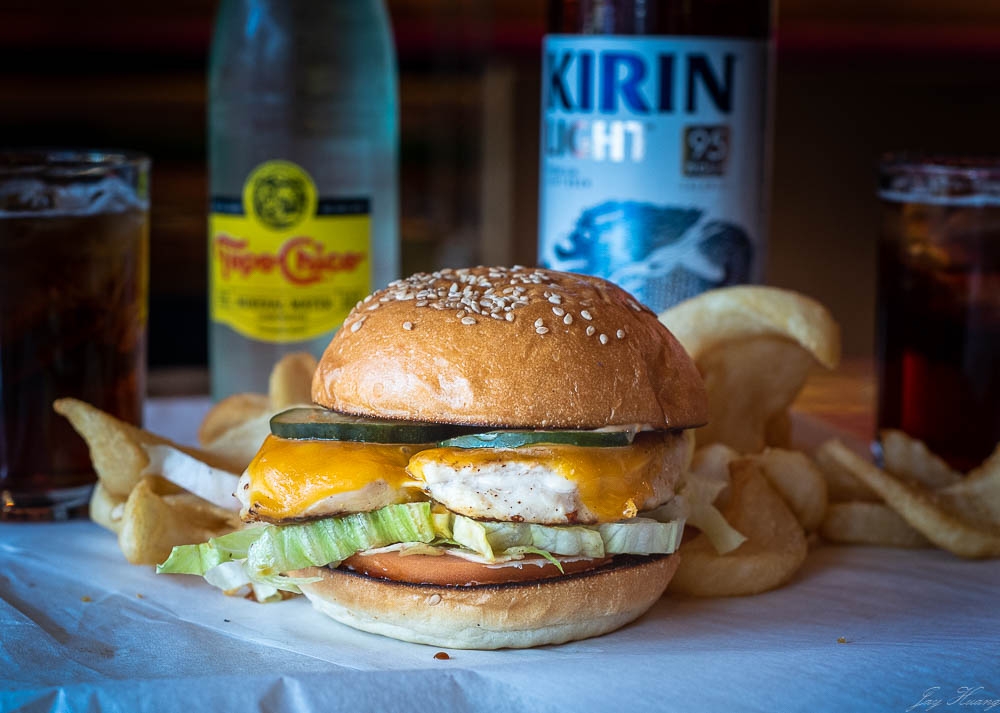 Natural chicken breast, house pickles, cheddar cheese, lettuce, tomato, Luck’s sauce, tonkatsu ketchup