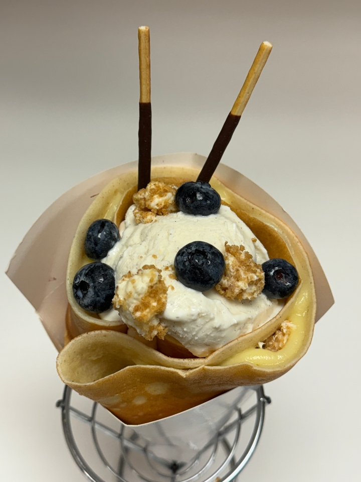 Blueberries, custard cream, whipped yogurt, cheese cake bites, blueberry reduction, vanilla gelato, pocky sticks