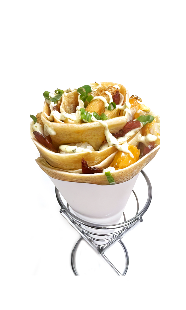 Bacon Jam, Cheddar Cheese, Yellow Onion, Potatoes and Avocado drizzled with Serrano Aoli and garnished with Slivered green onions