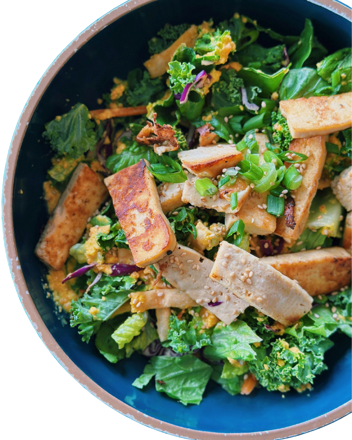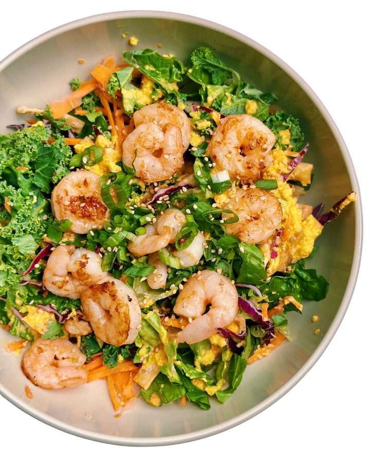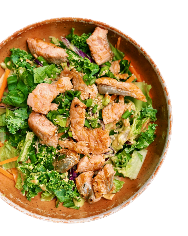 Romaine, kale, green onion, red cabbage, carrots, wontons with salmon. You choose your salad dressing.