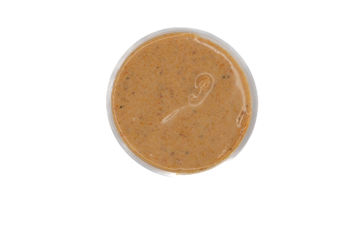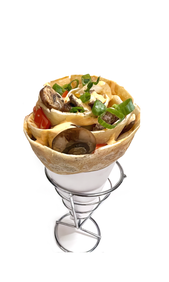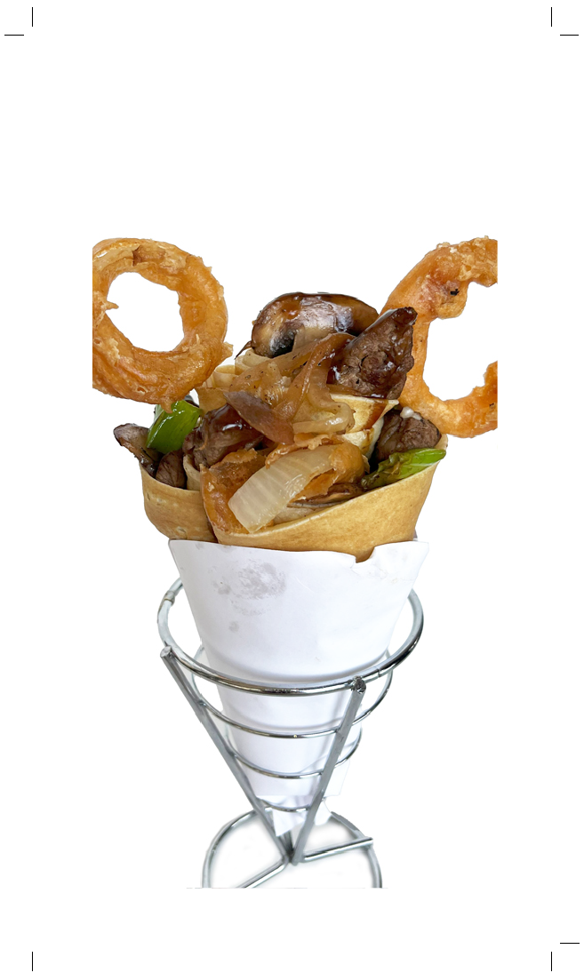 Wagyu Sausage Patties, Cheddar Cheese, Mushrooms, Yellow Onions and Red Bell Pepper drizzled with Spicy Mayo and garnished with Slivered Green Onions