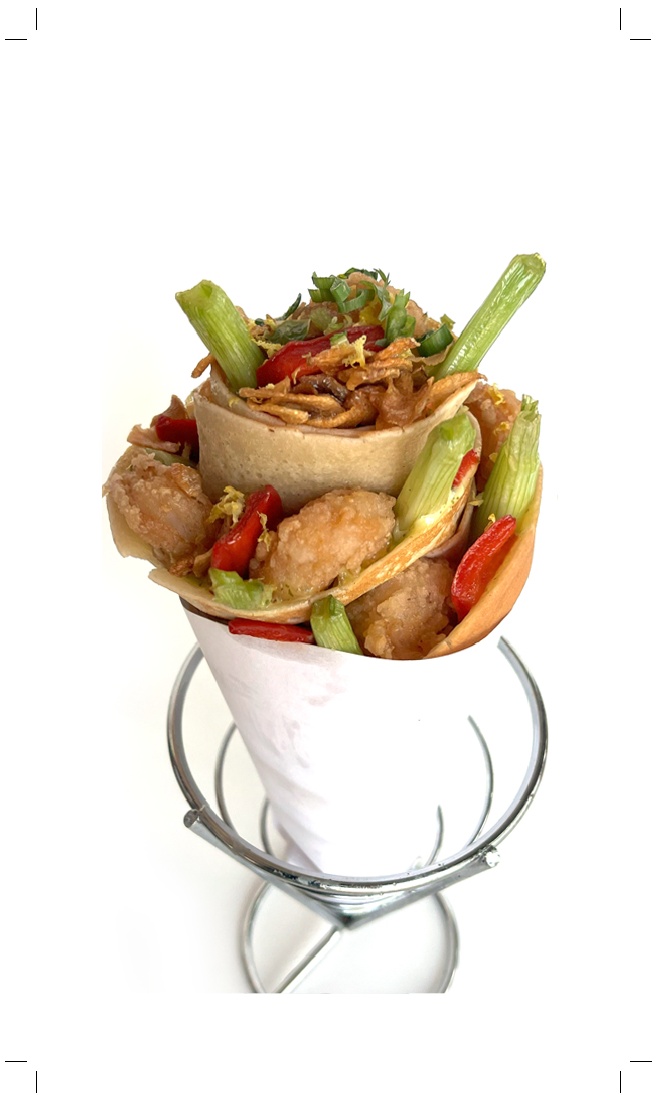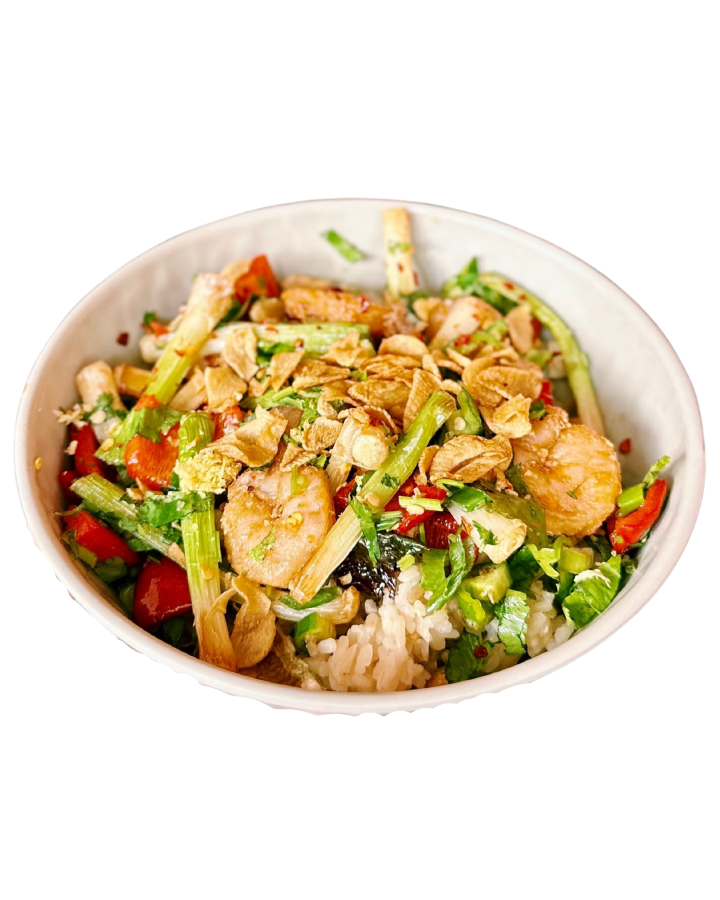Crispy natural tiger shrimp, red bell peppers, serrano, scallions, cilantro, lemon zest, Szechuan pepper, sea salt and fried garlic served over rice.