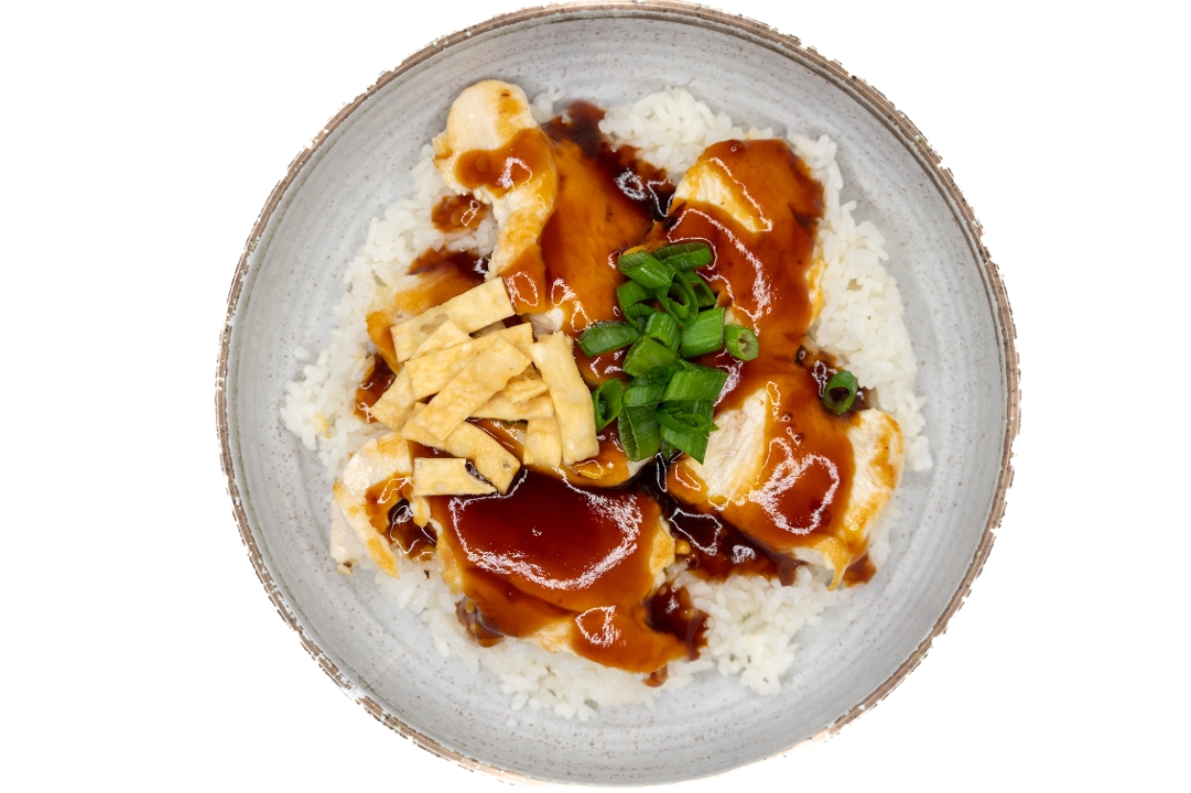 Chicken breast, spicy teriyaki sauce, green onion, wontons over rice.