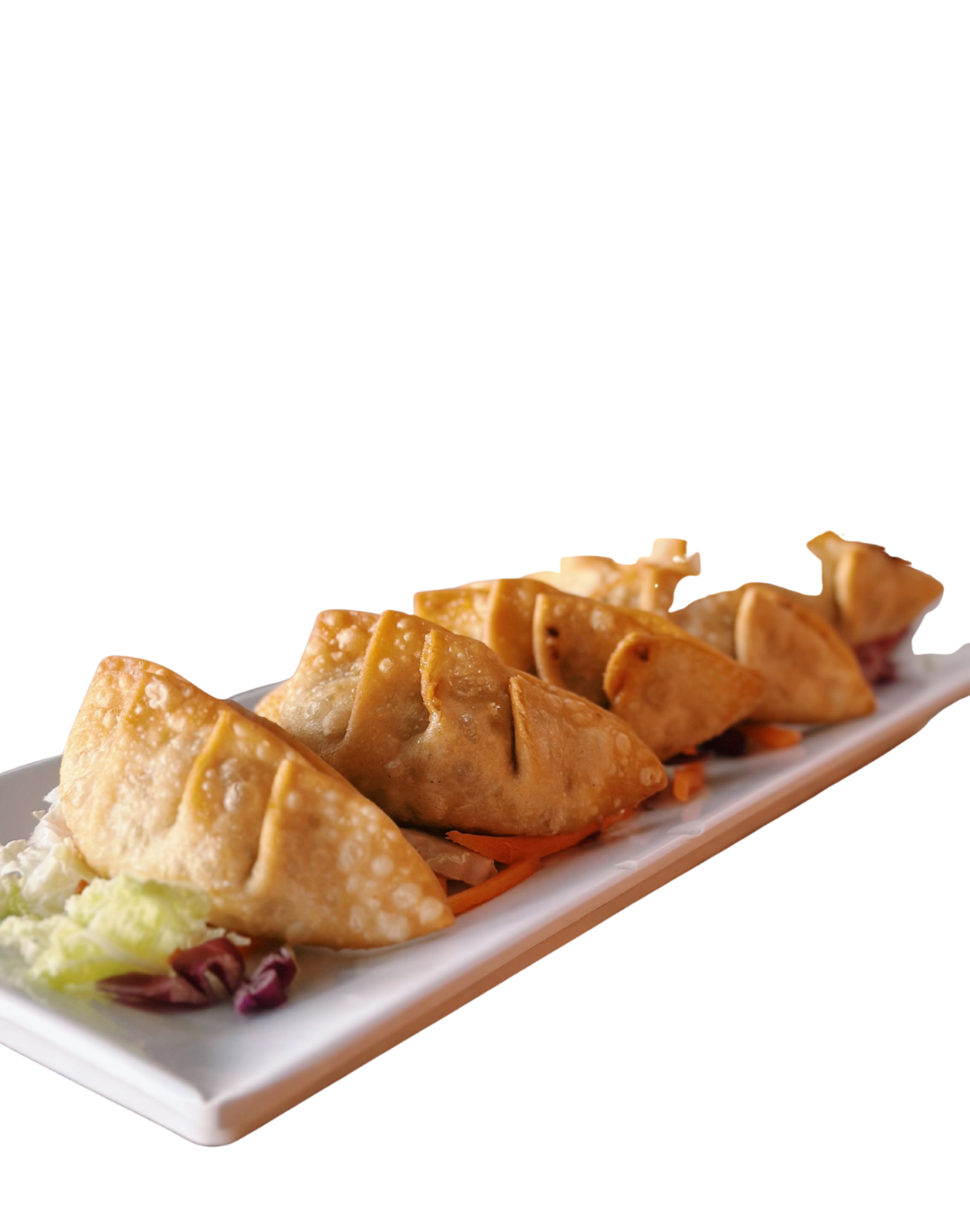 Romaine, kale, green onion, red cabbage, carrots, wontons with shrimp. You choose your salad dressing.