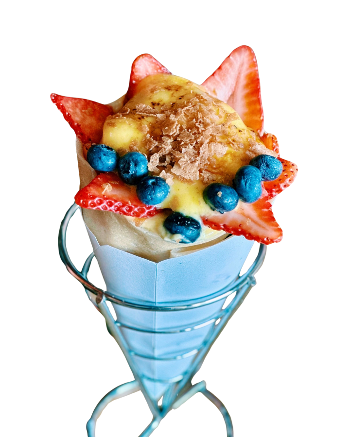 Strawberry, blueberries, caramelized topping creme brulee, wafer crunch flakes