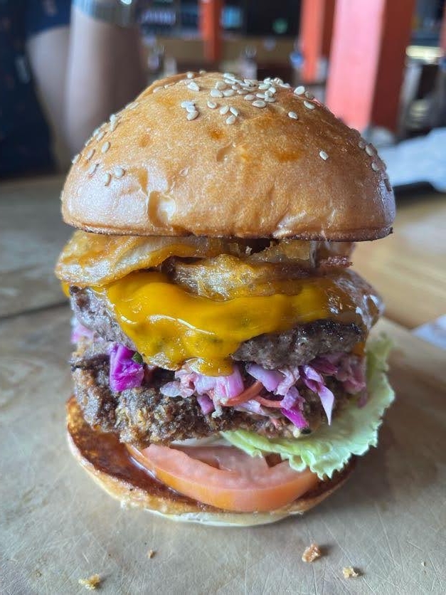 Panko crusted wagyu beef, asian slaw, tonkatsu ketchup, tomato, Luck’s sauce, Swedish Hill bun