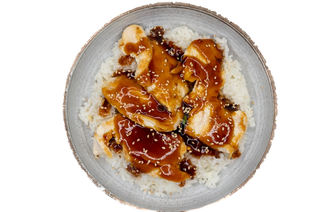 Natural dark chicken, sesame seeds with teriyaki sauce, over rice