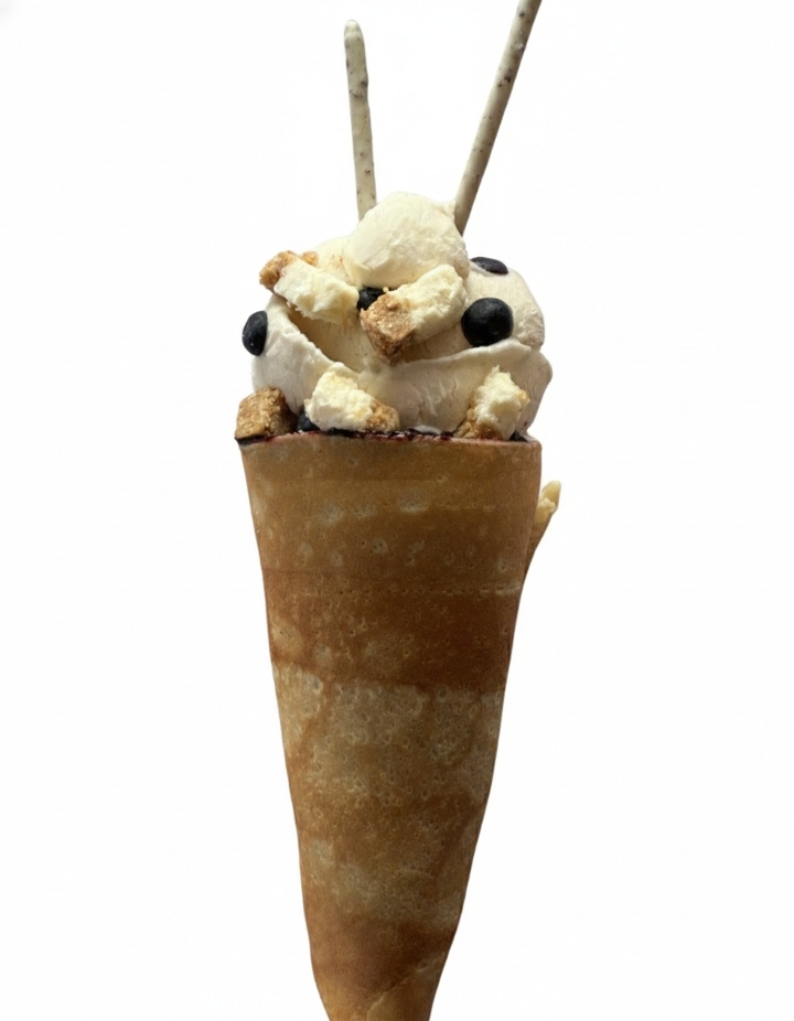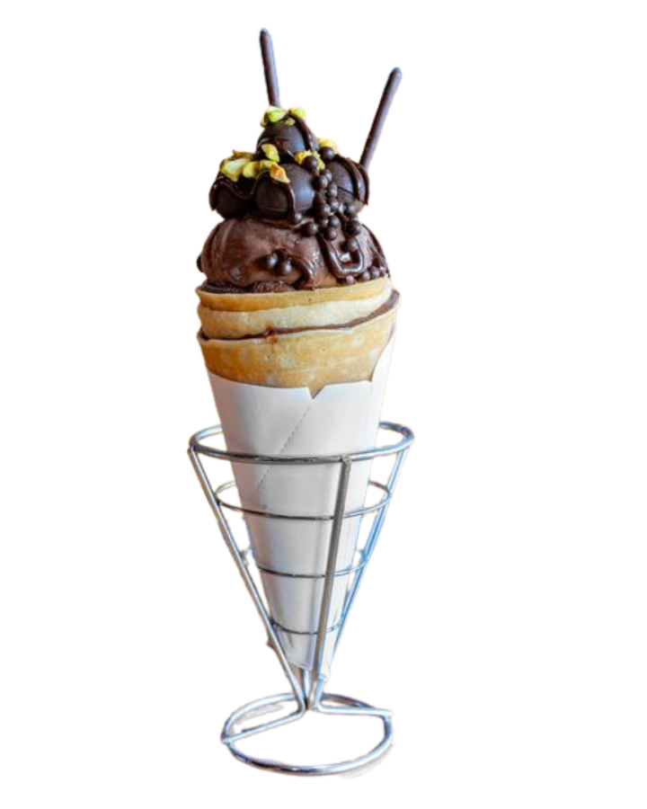 Chocolate truffles, whipped yogurt, chocolate custard cream, chocolate pearls, chocolate sauce, chocolate gelato, crushed pistachio, chocolate pearls, pocky sticks