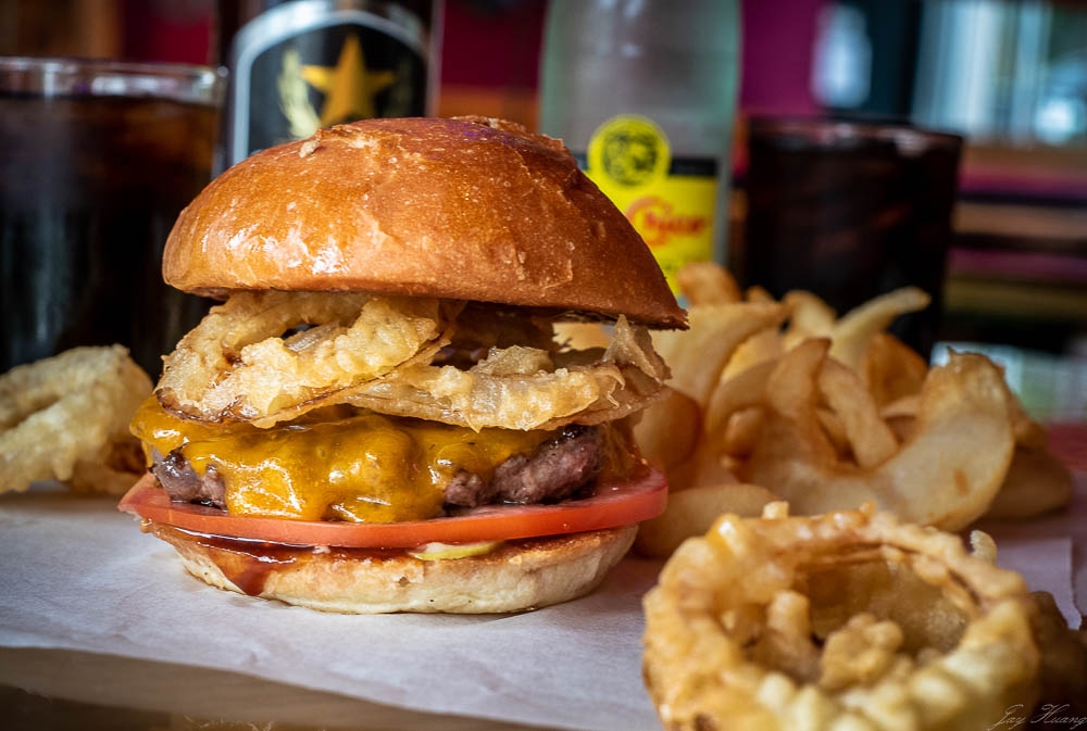 Texas waygu burger, mild cheddar, tempura onion rings, house pickles, japanese bbq ketchup, tomato, miso mustard