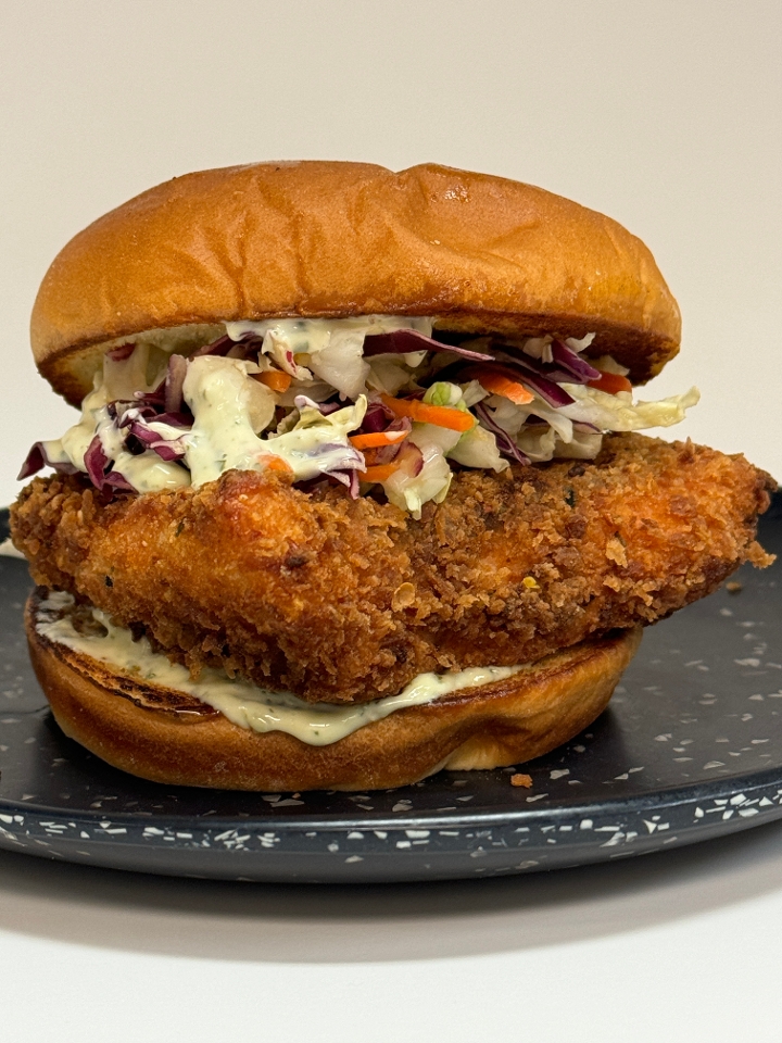 Katsu Breaded Salmon filet with asian slaw, lemon zest and serrano aoli served on a sweet Hawaiian Bun