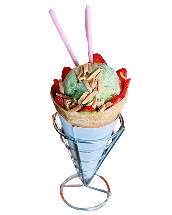 Matcha custard cream, strawberries, chocolate truffles, whipped yogurt, crushed pistachio, chocolate sauce