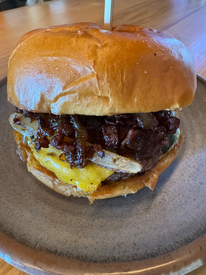 Bacon Jam Burger - Texas Wagyu Burger, Miso Mustard, Serrano Aioli, Cheddar Cheese, Pickles, Caramelized Onions, House Bacon Jam with a Slow Dough Challah Bun