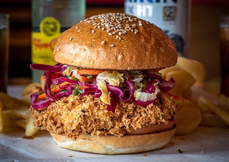 Crispy chicken breast, asian slaw, Luck’s sauce, tonkatsu ketchup, Kings hawaiian sweet bun