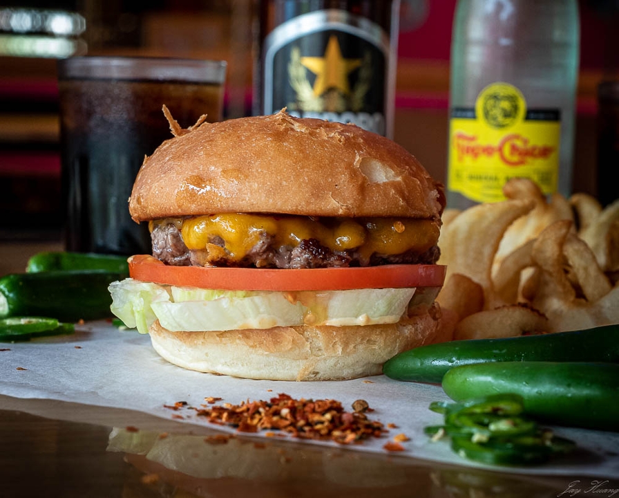 Texas wagyu beef burger, cheddar cheese, lettuce, tomato, tonkatsu ketchup, honey karashi mustard