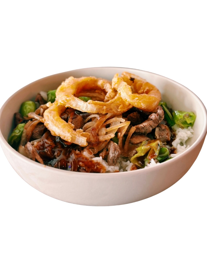 Organic steak with crimini mushrooms, caramelized onions, shishito pepper finished with teriyaki sauce, topped with tempura onion rings, served over rice