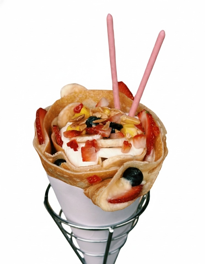 Strawberries, banana, blueberries, mango, custard cream, whipped yogurt, almonds