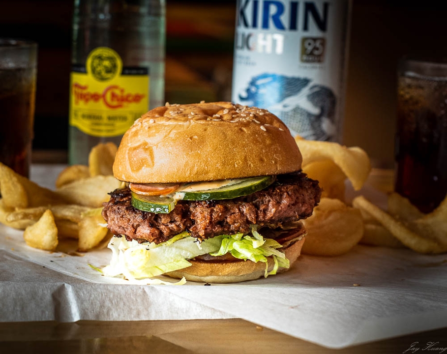 Beyond beef patty, house pickles, lettuce, tomato, Luck’s sauce, tonkatsu ketchup