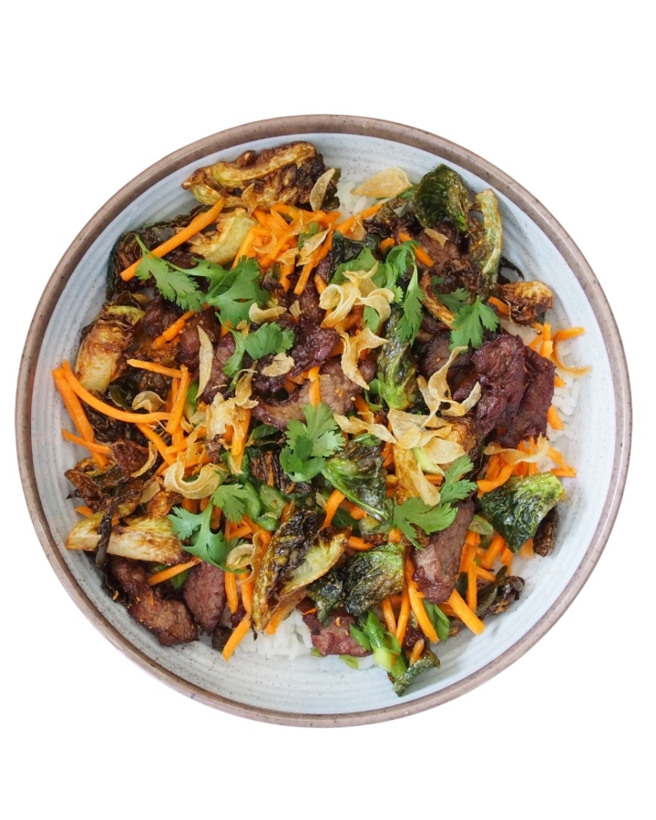 Organic steak & brussels sprouts, carrot, scallions, crispy garlic,cilantro, savory caramel glaze, served with rice *Gluten-Free*