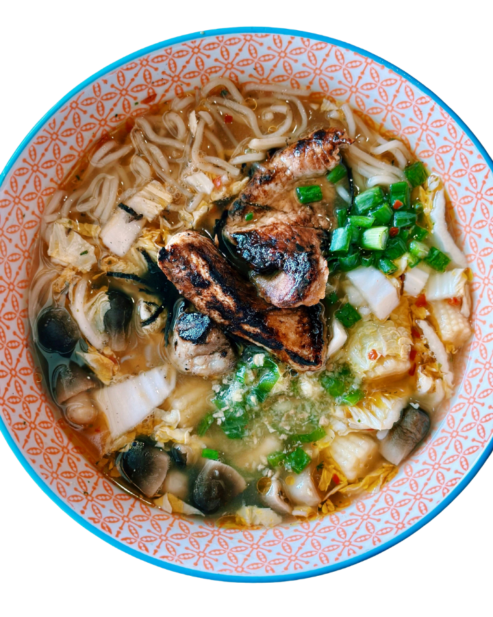 ramen noodles, charred pork loin straw mushrooms, baby corn, spicy miso broth, nori, pickled ginger