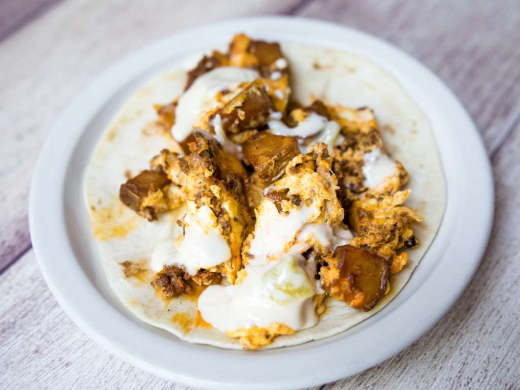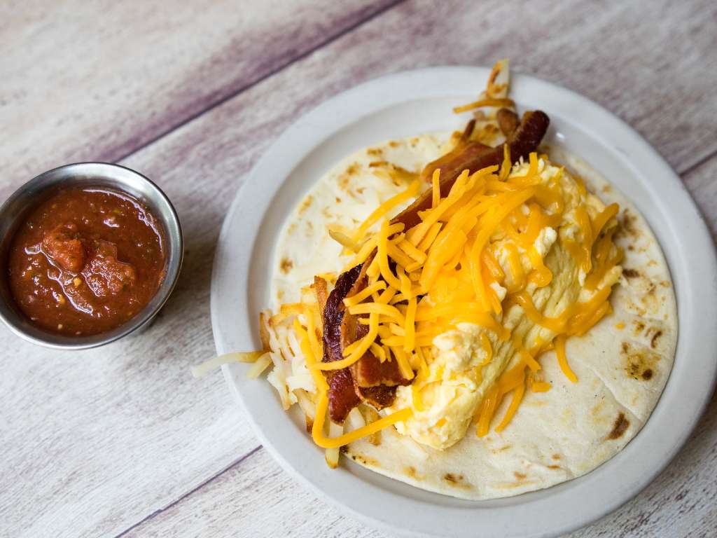 Egg, choice of meat, black beans & tater tots wrapped in a flour tortilla & topped with Queso Blanco, Ranchero sauce & avocado. Served with wedge potatoes