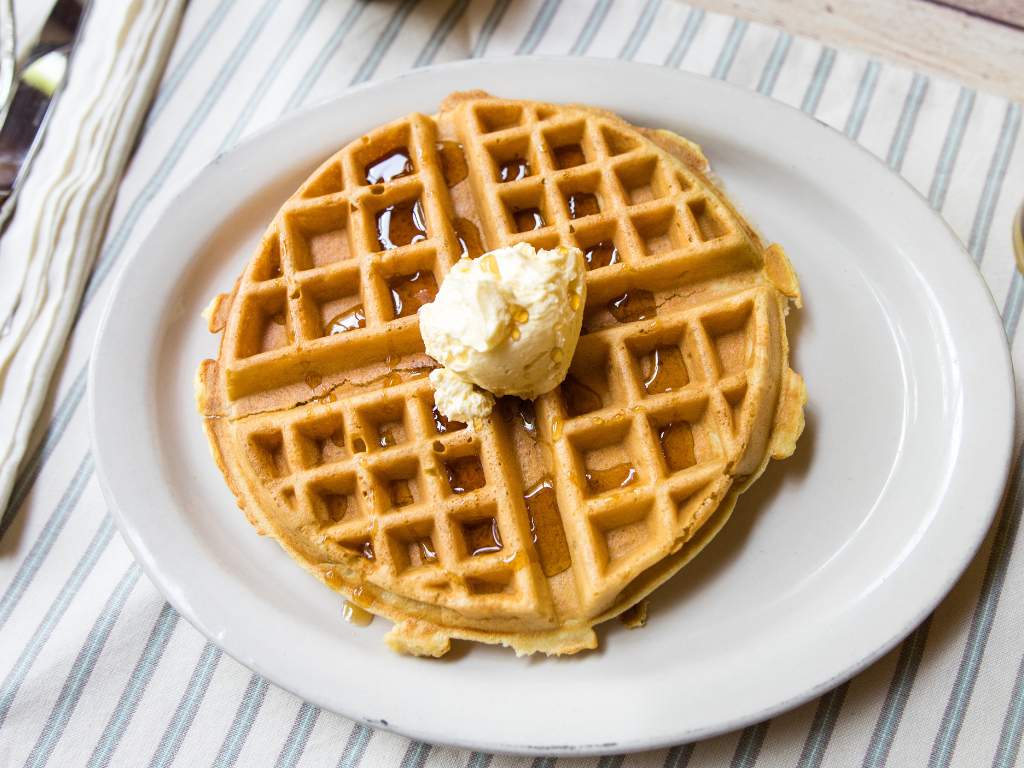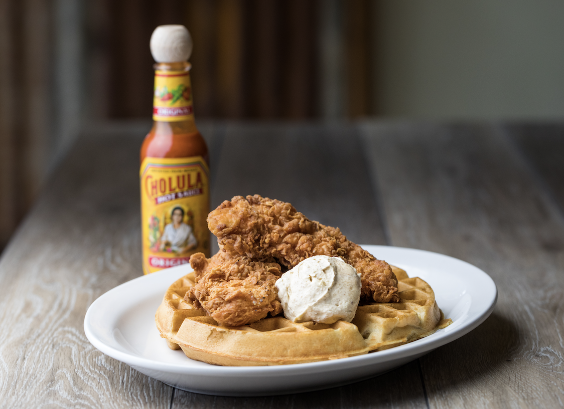 Our Golden Waffle topped with fried chicken tenders, brown sugar cinnamon butter & served with Cholula