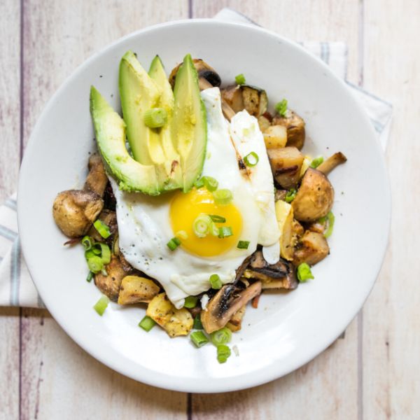 Seasoned potatoes, avocado, chives, green & red bell pepper with choice of bacon, ham, sausage, chorizo or veggies. Topped with two eggs over-medium