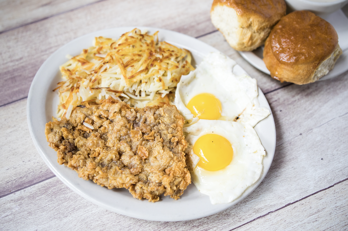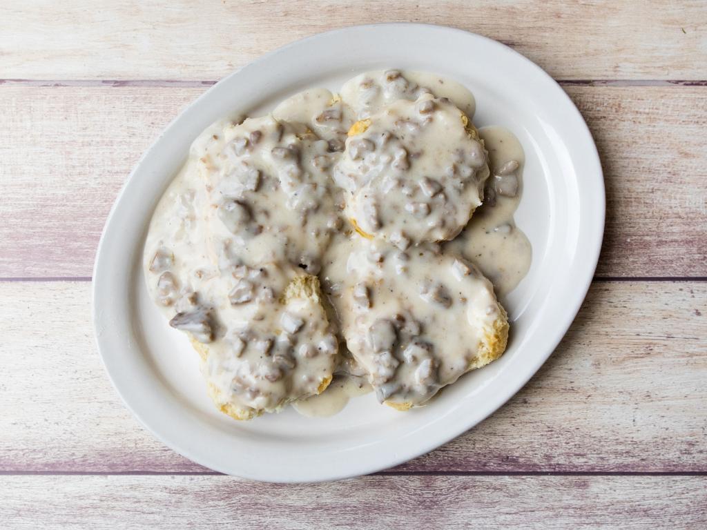 Served with two eggs any style, hashbrowns, peppered cream gravy & your choice of biscuit or toast
