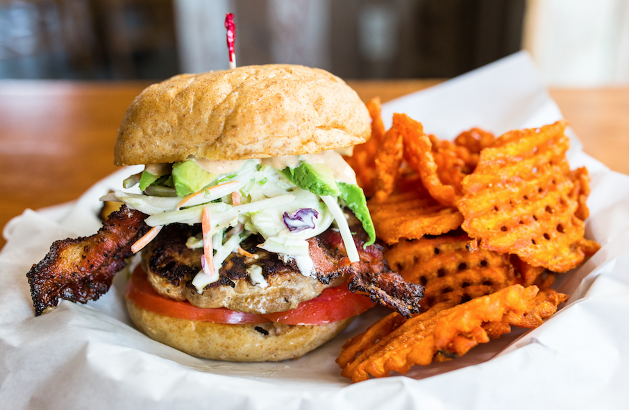 Umami turkey burger, superfood slaw, thick bacon, swiss, tomato and chipotle aioli served on a wheat bun