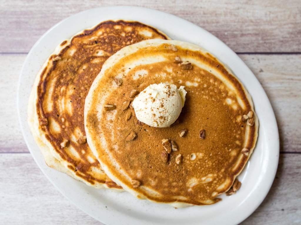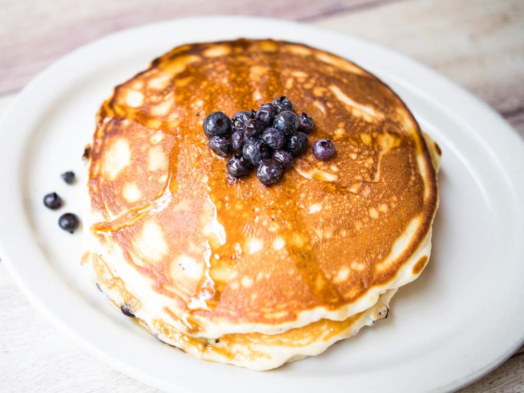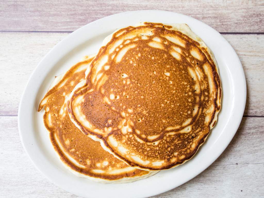 One fresh scrambled egg, buttermilk pancake and a slice of bacon or sausage with a small milk or juice