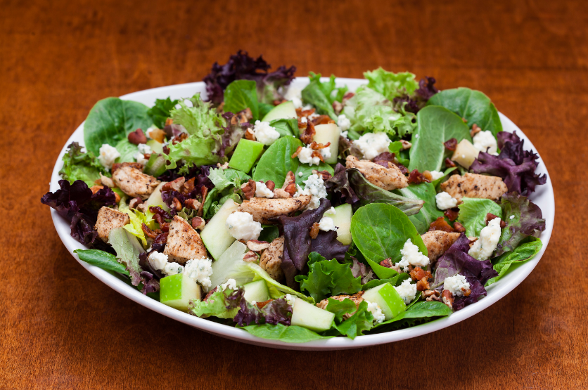 Seasoned grilled chicken, bacon, Bleu cheese crumbles, toasted pecans and Granny smith apples on mixed greens with homemade apple cider vinaigrette