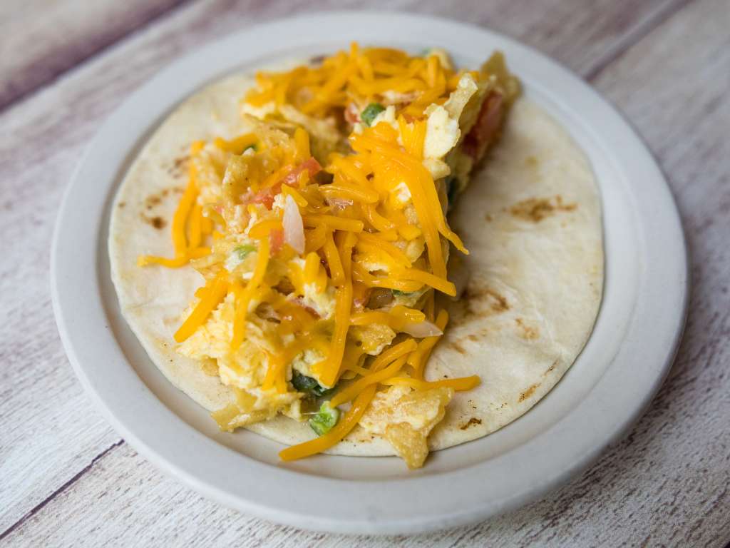 Egg, tomatoes, jalapeños, onions, crushed tortilla chips & cheddar