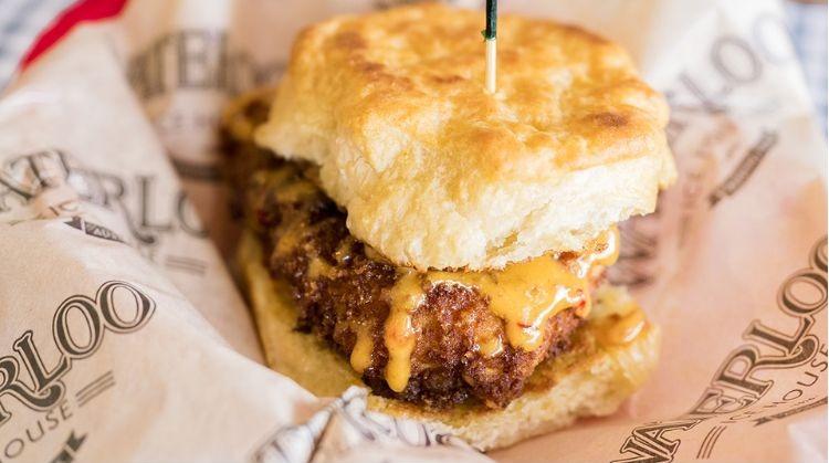 Grilled biscuit with panko fried chicken, Bang Bang sauce & hot honey