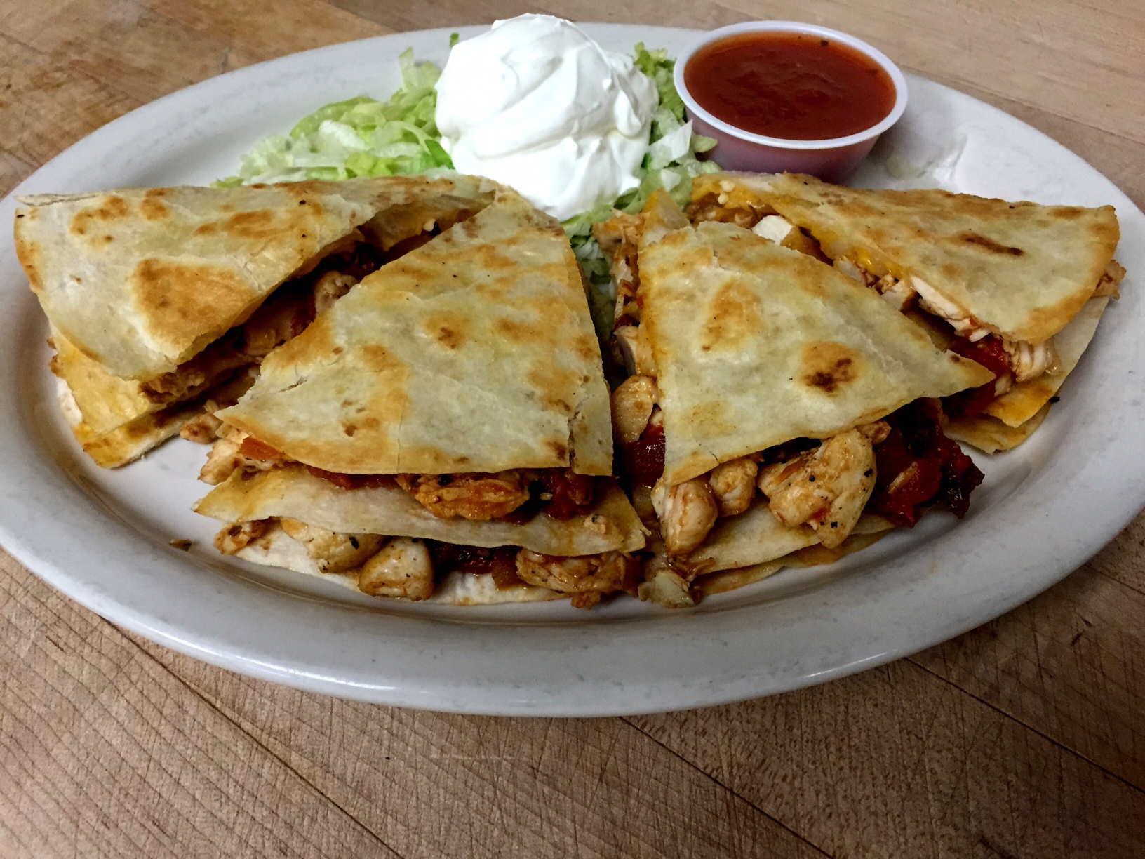 Choice of grilled chicken, picadillo beef, housemade pulled pork or grilled veggies layered with spicy stewed tomatoes, onions & poblano peppers with jack & cheddar cheese. Served with sour cream & salsa