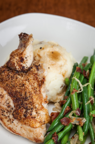Comfort food at its finest. Skin-on boneless breast and drumette seared and slow-roasted to retain succulent juices and natural flavor, served with bacon braised green beans and mashed potatoes