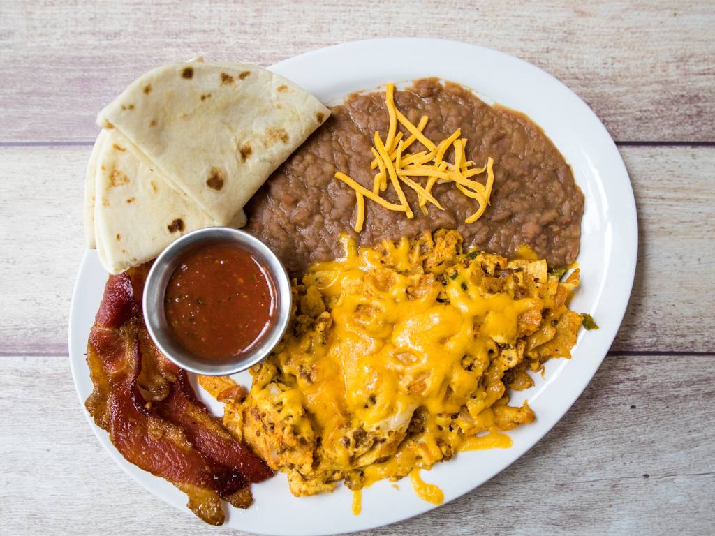 Eggs scrambled with tomatoes, onions, jalapeños, cheddar & tortilla chips. Served with refried beans, tortillas & choice of bacon, sausage or ham.