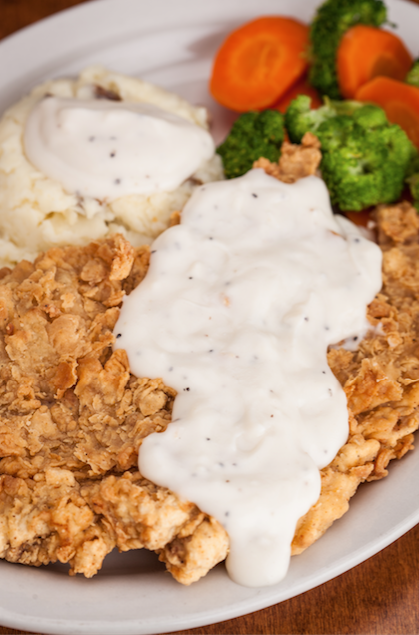 The culinary staple of the Lone Star State. Tender steak or chicken breast seasoned and fried in our signature Shiner Bock buttermilk batter, then smothered in peppered cream gravy, with mashed potatoes and bacon-braised green beans