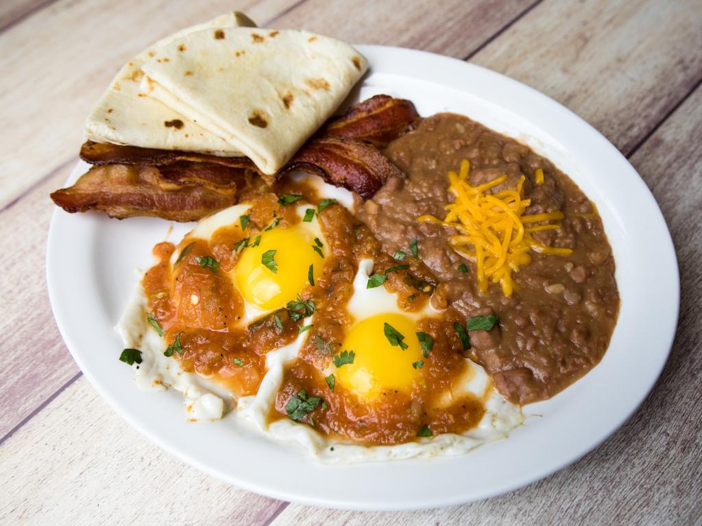 Two eggs any style, topped with ranchero sauce, refried beans & tortillas. Served with choice of bacon, sausage or ham
