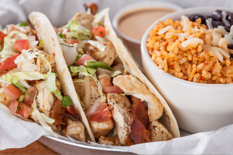 Marinated fajita chicken or beef with grilled onions and bell peppers, served with Cheddar cheese, sour cream, guacamole, Mexican rice, refried beans, lettuce and pico de gallo. Flour, corn or whole wheat tortillas