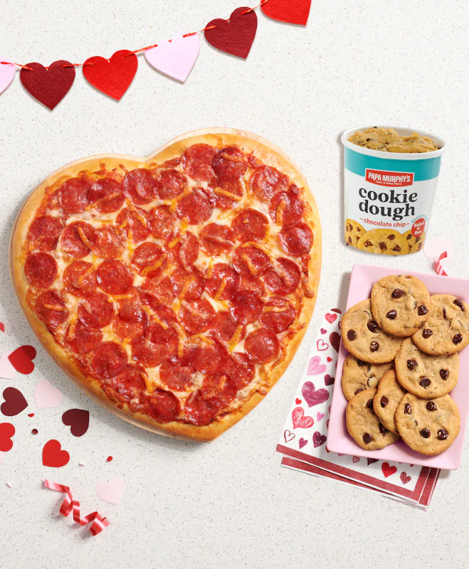 Plan the perfect Valentine’s Day with a Sweetheart of a Deal. Made in the shape of a heart, with premium Pepperoni, Whole-Milk Mozzarella and Traditional Red Sauce with our Chocolate Chip Cookie Dough.