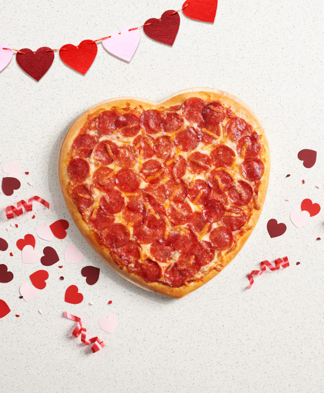 Plan the perfect Valentine’s Day with our HeartBaker® Pizza. Made in the shape of a heart, with premium Pepperoni, Whole-Milk Mozzarella and Traditional Red Sauce.