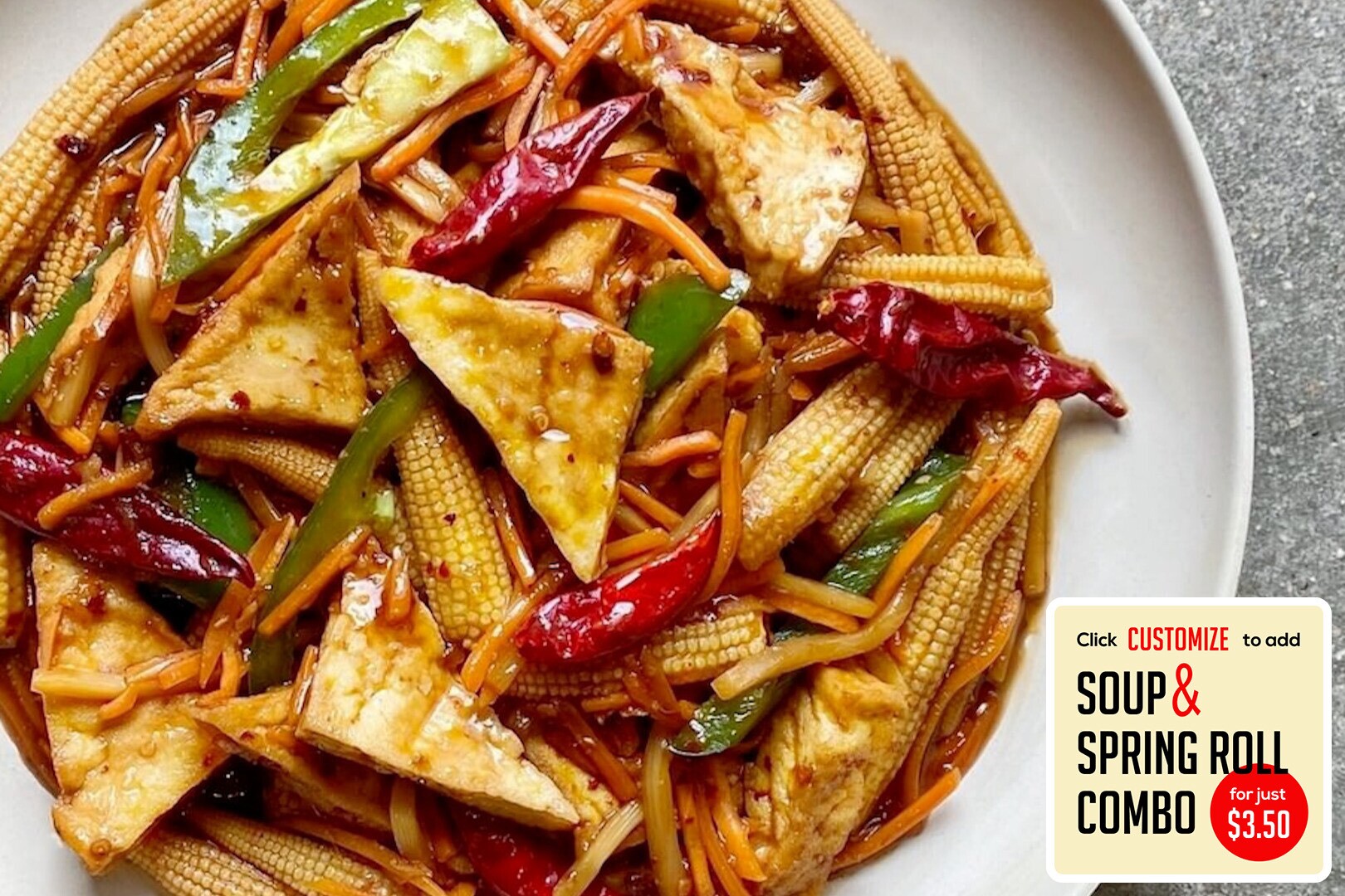 Flash-fried tofu in a spicy vegan & gluten-free Szechuan sauce w/ baby corn, carrots, jalapenos, bamboo shoots, & chili peppers