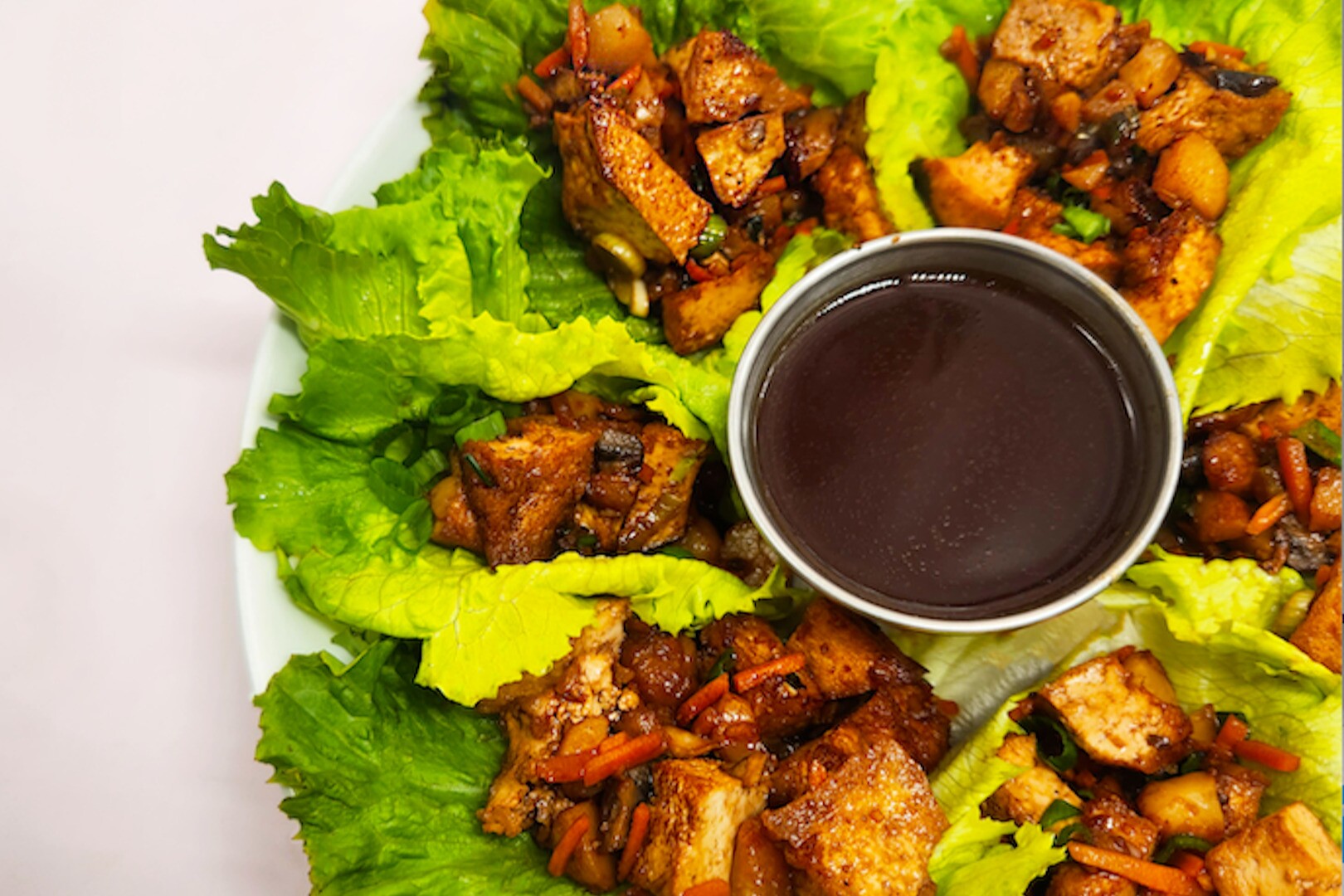 Vegan. Savory fried Tofu, crunchy water chestnuts, with delicious mushrooms and carrots, topped with green onions and served with our house-made hoisin sauce. Guaranteed to be your new go-to favorite!