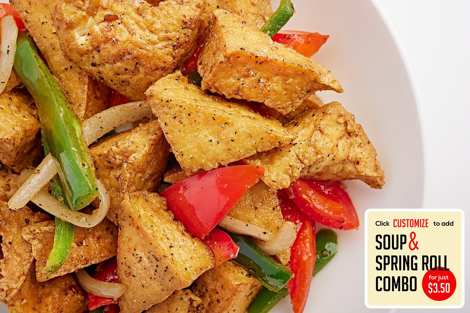 Crispy tofu wok tossed with jalapeños, bell peppers, and onion.