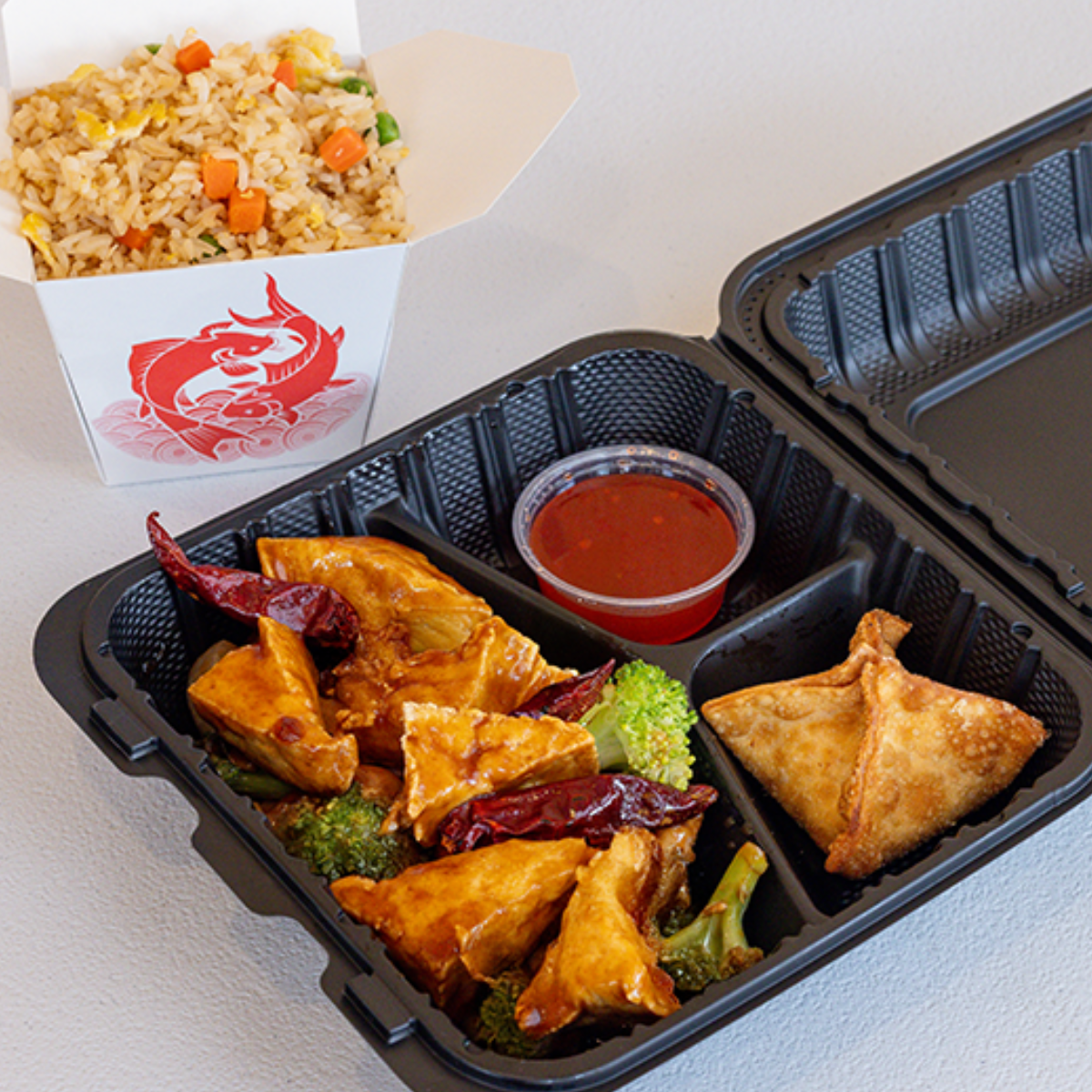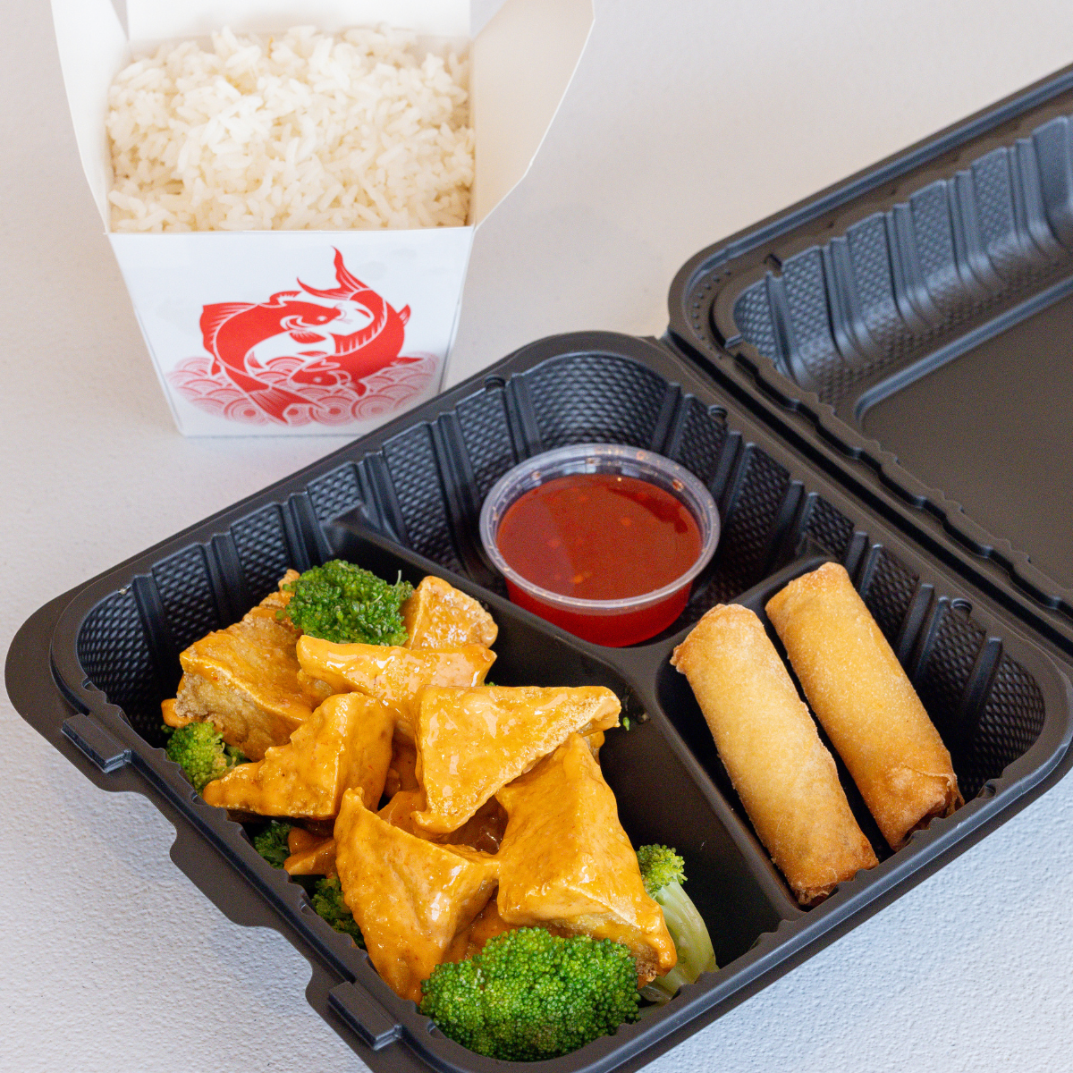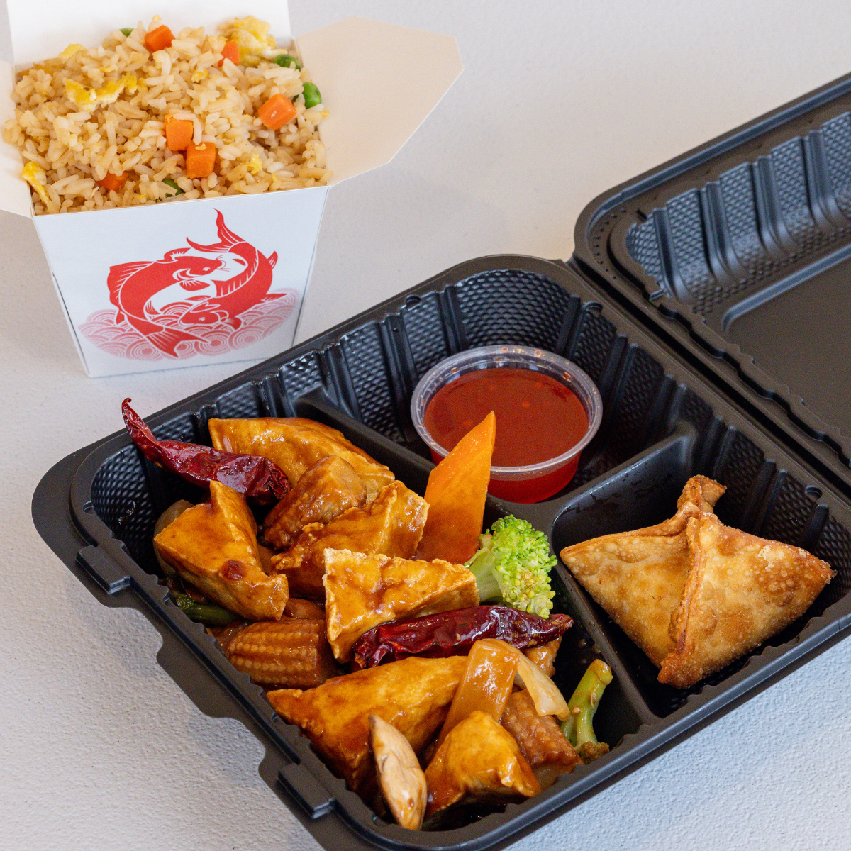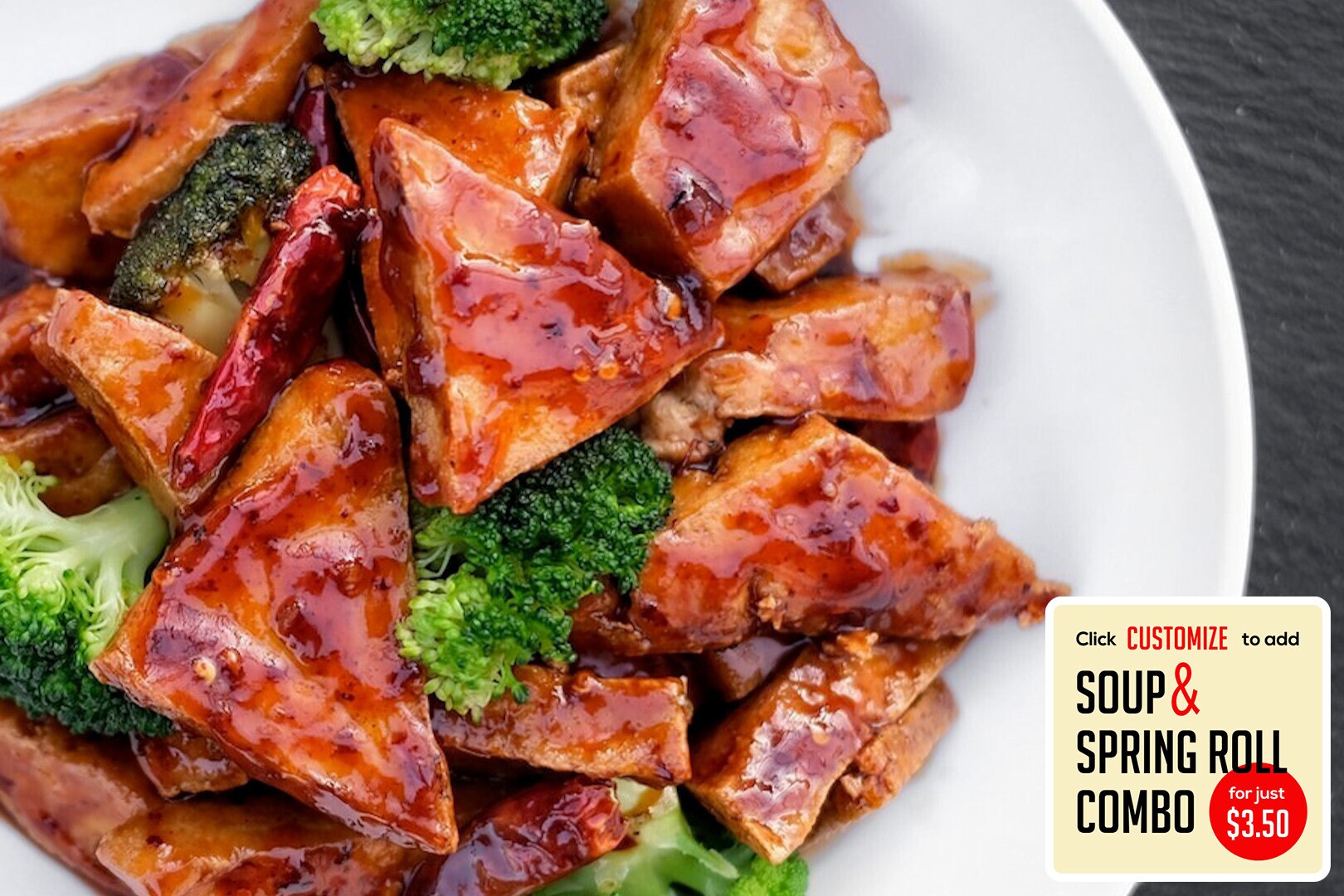flash fried tofu stir fried in a vegan, gluten-free General Tso sauce w/ broccoli and peppers